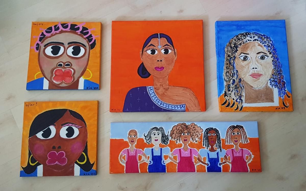 Enfin, de beheerder haalde me over om mijn uitprobeersels te exposeren. Het was best eng om voor het eerst iets intiems, wat eigenlijk alleen voor mezelf bedoeld was, met anderen te delen. Ik heb ontzettend leuke reacties gehad en hield contact. Samen met mijn man – hij heeft de kunstacademie gedaan – heb ik voor het 25-jarig bestaan van de woontoren de exporuimte omgetoverd tot een Mini Marrakesh-expo. Compleet met muurschildering, draperie en lantaarns aan het plafond, mijn eigen Marokkaanse slippers op de vloer en zelfgekleide handjes van Fatima aan de muur. We waren net terug van vakantie uit Marrakesh en hebben ons daar enorm laten inspireren door de rijke kunst en cultuur in Marokko.
